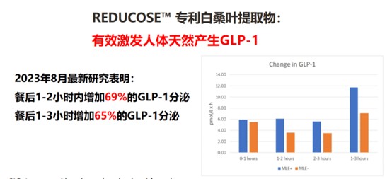 而提取自天然植物成分的专利Reducose™,其活性成分与葡萄糖分子高度相似,可先于碳水化合物与人体内负责分解糖的消化酶结合,减少碳水吸收;经临床试验证实,这些未经消化的碳水到达小肠末端后,可在餐后1-2小时增加人体69%的GLP-1分泌,并维持数小时的高GLP-1分泌水平,它们可以激发中枢神经持续释放饱足信号,而“持续的饱腹感”对想要减重的人来说至关重要。