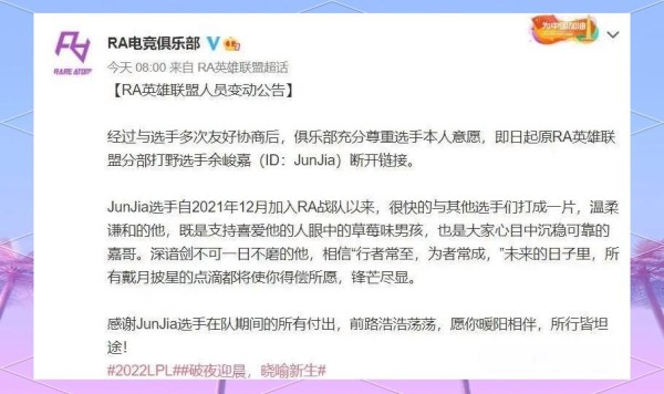 随后,RA俱乐部宣布Leyan(乐言)将担任战队的首发打野,而JunJia则被置于替补席,这一变动似乎为JunJia的离开埋下了伏笔。不久后,RA俱乐部在官方平台发布声明,确认了JunJia的离开。声明中提到,经过与JunJia的友好交谈和沟通,俱乐部决定尊重他的意愿,自即日起,JunJia正式退出RA战队,不再担任打野位置。回顾JunJia在RA战队的时光,他与队友们相处融洽,赢得了大家的尊重。我们感谢他为战队做出的贡献,并祝愿他未来一切顺利!
