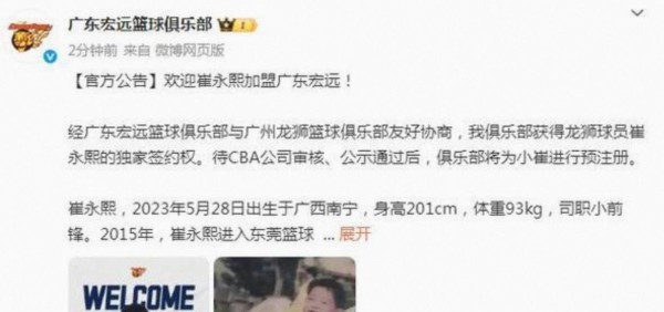 CBA转会新动向!广东男篮签下崔永熙,合同金额曝光