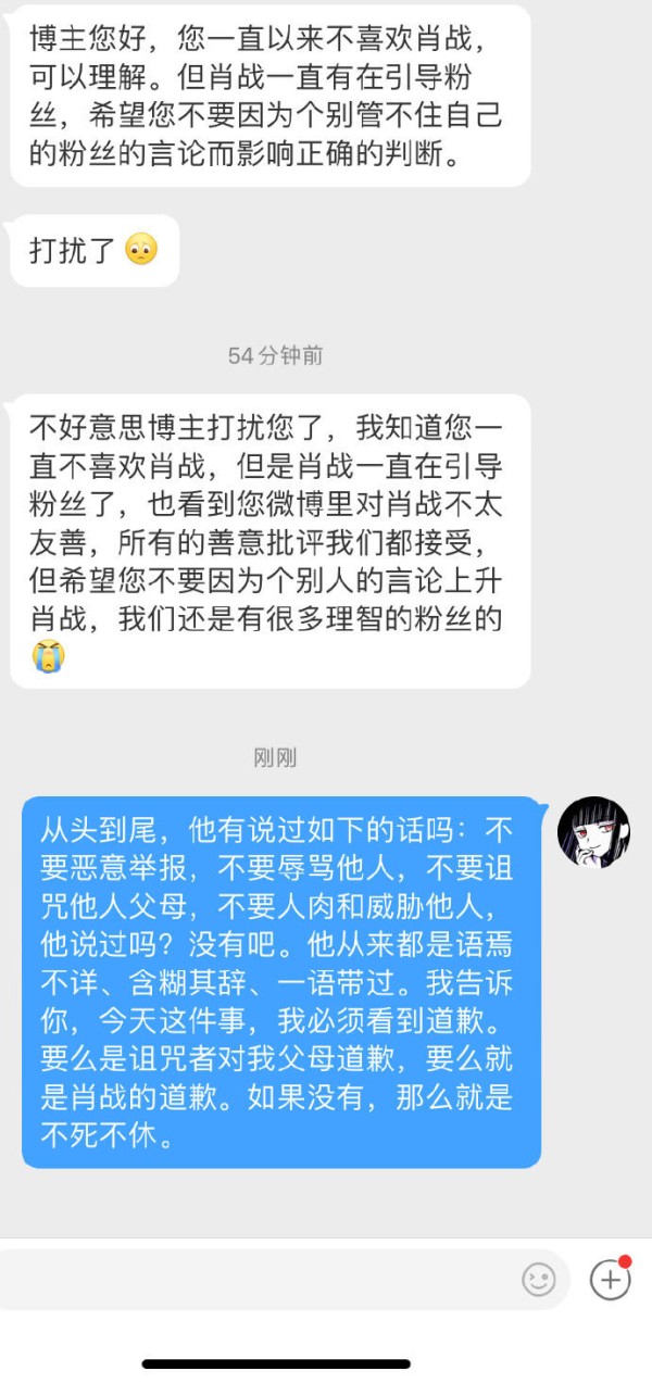 随后,就开始有部分粉丝私信这位博主,并道歉称大部分粉丝还是很理智的,肖战也一直在引导粉丝,看博主之前也发过很多对肖战不友善的言论,所有善意的批评她们都接受,只不过不希望博主因此而上升到肖战,惹得怒怼,从来没有听到肖战劝解粉丝,不要恶意举报,不要辱骂他人,不要诅咒他人父母,不要人肉和威胁他人,称从来都是含糊其辞,一笔代过,并称这件事要么始作俑者道歉,要么肖战道歉,否则就是不死不休。当然还有一些粉丝仍坚持到,为何网友骂你,就说是肖战粉丝呢?有什么理由吗?博主却根本不屑回应。