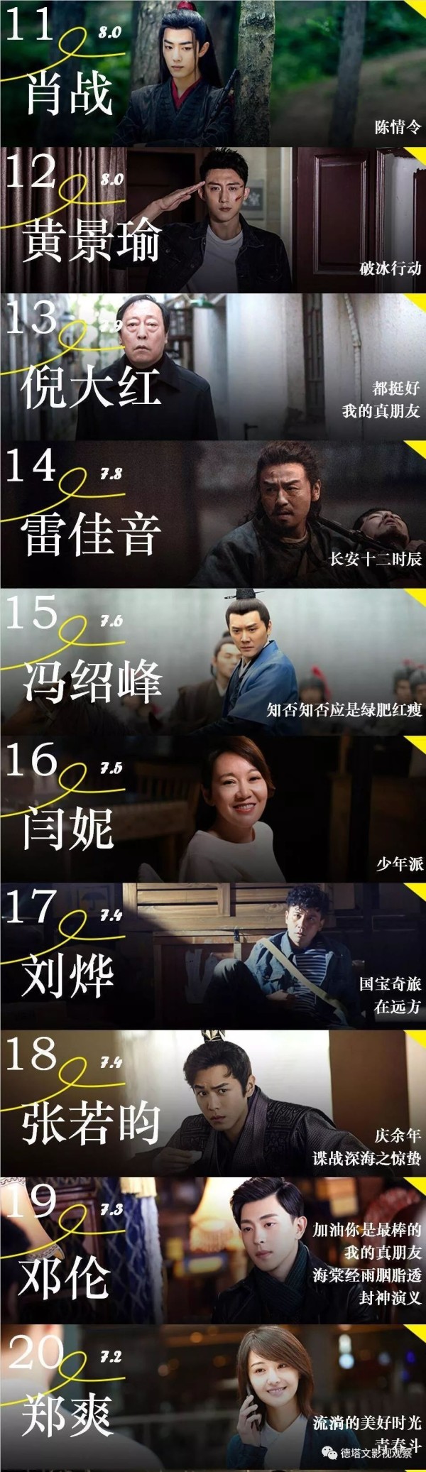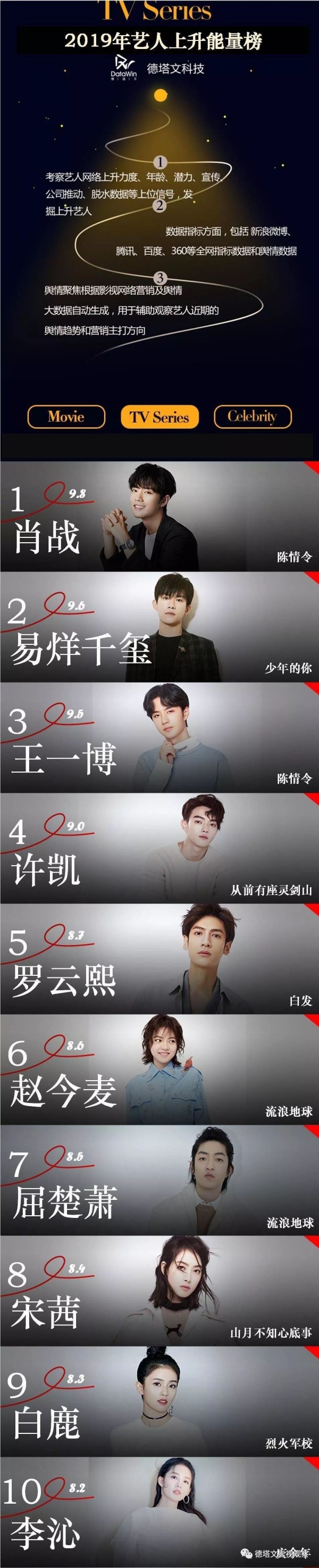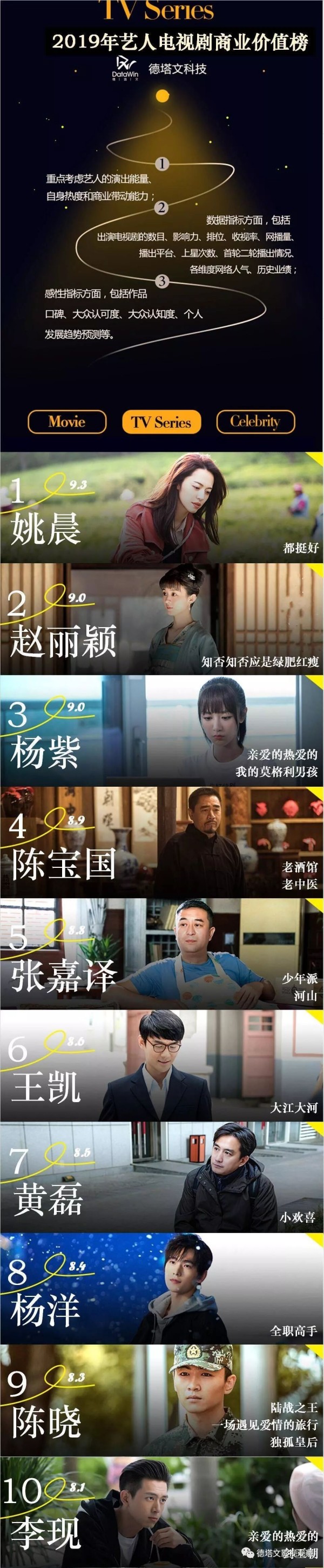 德塔文2019年影视艺人商业价值榜:上升榜、电视、电影、网络影响力