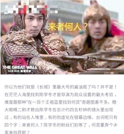 《长城》电影宣传时,各大鲜肉明星如鹿晗、彭于晏、黄轩、郑恺、王俊凯等备受瞩目,仿佛他们将在影片中占据重要位置。然而,当粉丝们真正踏入影院时,却发现自家爱豆的戏份寥寥无几,甚至可以用秒表来计算他们的出场时间。