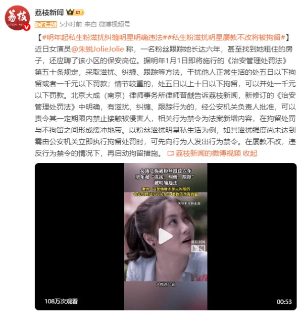 近日女演员朱锐称,一名粉丝跟踪她长达六年,甚至找到她租住的房子,还应聘了该小区的保安岗位。据明年1月1日即将施行的《治安管理处罚法》第五十条规定,采取滋扰、纠缠、跟踪等方法,干扰他人正常生活的处五日以下拘留或者一千元以下罚款;情节较重的,处五日以上十日以下拘留,可以并处一千元以下罚款。北京大成(南京)律师事务所律师晋虤告诉荔枝新闻,新修订的《治安管理处罚法》中明确,有滋扰、纠缠、跟踪行为的,经公安机关负责人批准,可以责令其一定期限内禁止接触被侵害人,相关行为禁令为法案新增内容,在拘留处罚与不拘留之间形成缓冲地带。以粉丝滋扰明星私生活为例,如其滋扰强度尚未达到需由公安机关立即执行拘留处罚时,可先向行为人发出行为禁令。在屡教不改,违反行为禁令的情况下,再启动拘留措施。