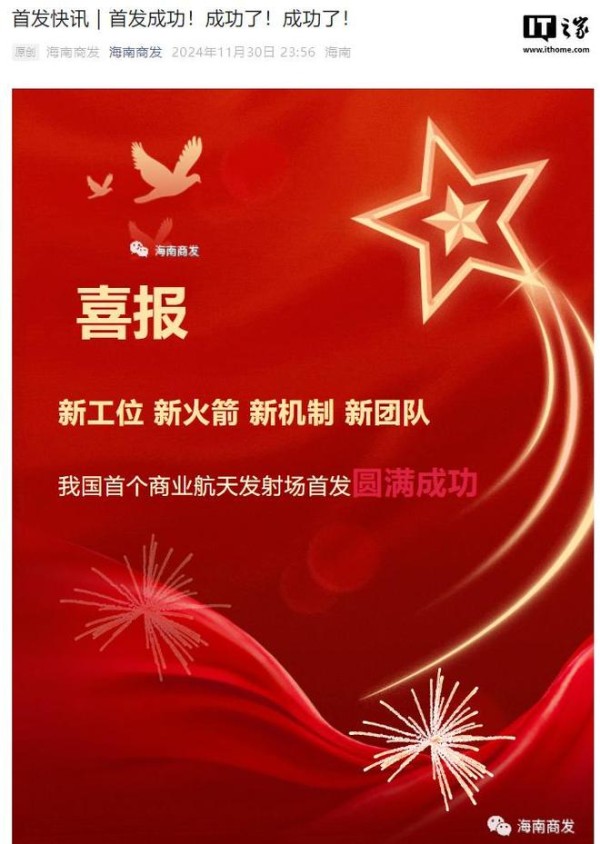 IT之家 12 月 1 日消息,2024 年 11 月 30 日晚 22 时 48 分,我国首个商业航天发射场 —— 海南商业航天发射场首次发射取得圆满成功。新型火箭长征十二号成功将卫星互联网技术试验卫星、技术试验卫星 03 星送入预定轨道。