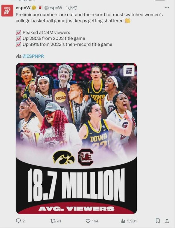 北京时间4月9日,ESPN公布了今年NCAA女篮决赛的收视率:平均观看人数为1870万人,最多时刻为2400万人。比2023年女篮决赛高89%,比2022年女篮决赛高285%。2019年至今,除了奥运会和NFL,观赛人数最多的比赛!