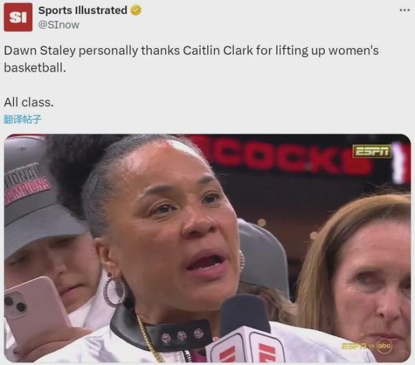 南卡大学本赛季38胜0负,一场都没输过,完美战绩夺冠。南卡主帅Dawn Staley在领奖台上专门致敬克拉克:“我要亲自感谢凯特琳-克拉克,谢谢她为这项运动带来的影响力。她是这项运动中的GOAT之一,我们真的非常感谢她。”