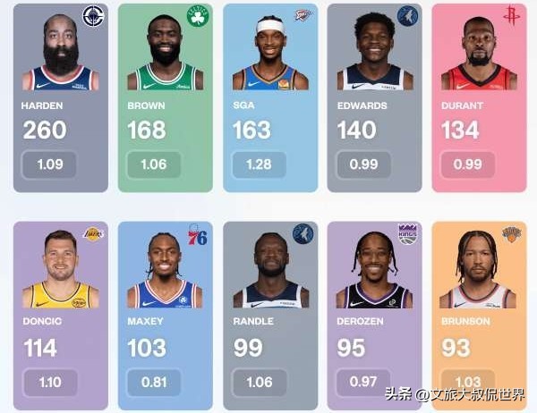 1、快船队后卫球星哈登总计260回合,每回合单打场均1.09分;