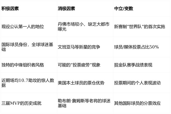 当然,具体票数还会受到多种变量影响:如果掘金队能在投票期间保持西部前列战绩,将增强他的候选优势;如果他能在投票加速日前后有特别出色的表现,可能刺激最后一波投票潮。