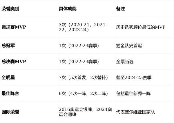 表:约基奇主要荣誉概览