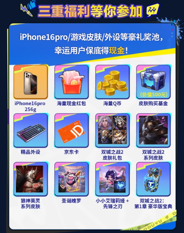 既有猛将上阵,怎能缺少福利助兴?这就不得不提斗鱼这波“史上最强冬季豪礼”了!12月24日-26日活动期间,观众登录斗鱼即可查看自己是否为“幸运用户”,幸运用户直接获得抽奖资格,可用于抽取豪礼宝箱!iphone16pro、海量现金红包、海量Q币、皮肤购买基金、电竞外设、京东卡、斗鱼周边等超绝福利全部拉满,而且保底获得现金!
