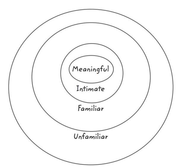 如果你想建立一个有价值的人脉网络,你必须关注你能为别人带来什么,而不是别人能为你带来什么。在我看来,每个人都有四种类型的人脉网络:陌生的、熟悉的、亲密的、有价值的。它们之间的关系就像下面这个同心圆所展示的那样: