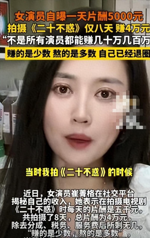 娱乐圈一位新人女演员崔箐格,爆料自己在电视剧中一天薪酬,将近5000元,最后总片酬高达4万元。