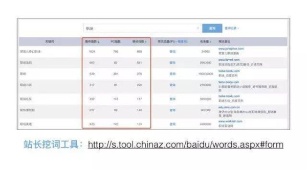 比如说职场,它就能搜索到职场这个关键词在百度上搜索量是多少,分别有移动端、PC端两个指数,我们更多考虑移动端的指数。