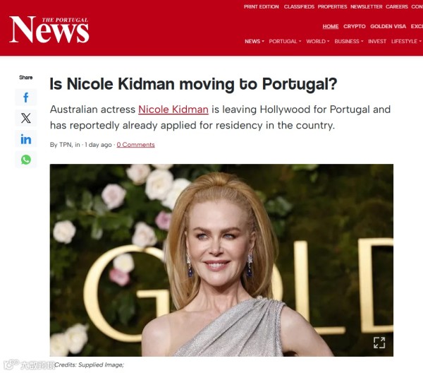 当好莱坞巨星妮可·基德曼(Nicole Kidman)的私人飞机降落在葡萄牙卡斯卡伊斯的Tires机场,一则“影坛巨星申请葡萄牙居留权”的消息迅速引爆全球关注——澳大利亚女演员妮可·基德曼已经申请了葡萄牙居留权。