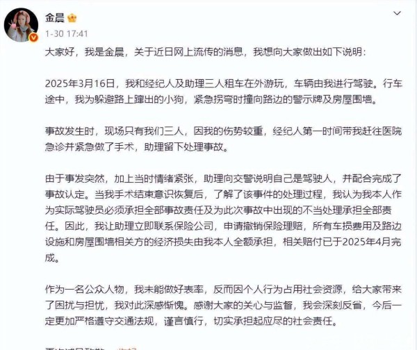接着再说金晨,这位曾凭借《孤注一掷》一炮而红的明星,也因为一件事捅了自己一刀。2026年初,突然有知情人爆出一桩涉及金晨的交通事故。在去年三月,她在浙江绍兴出行时发生了一起车祸。虽然事故本身不算太严重,但她的处理方式却让事情变得更加复杂。一般人遇到事故,都会承担责任,但金晨选择了逃避,与经纪人一同离开,竟让助理顶了锅。幸好有监控录像作证,事情暴露后网友们纷纷发声,不仅责怪她肇事逃逸,还批评她将助理当作替罪羊。面对舆论的压力,金晨终于出来回应,她表示自己逃跑是因为事发时伤势严重,经纪人带她去治疗,而助理则负责处理后续。金晨承认当时判断失误,并在事后承担了责任和赔偿。然而,网友们并未因此买账,仍对她的行为表示强烈不满。