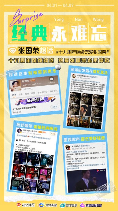 十九周年风继续吹热爱张国荣永不停歇[心]@杨幂 庆祝绿苑成立十六周年时光胶囊企划特别上线#白皮书乐队史策新歌分享会#@史策 @邮差老刘 空降超话畅聊新歌,互动唠嗑趣味不停~@林宥嘉YogaLin 变身美食博主午后空降分享“生活小确幸”@王子异 打卡出道四周年感恩粉丝长久陪伴@杨超越 空降超话派送绝美自拍!@郑云龙DL 惊喜出现,开启闲聊模式[赢牛奶]……