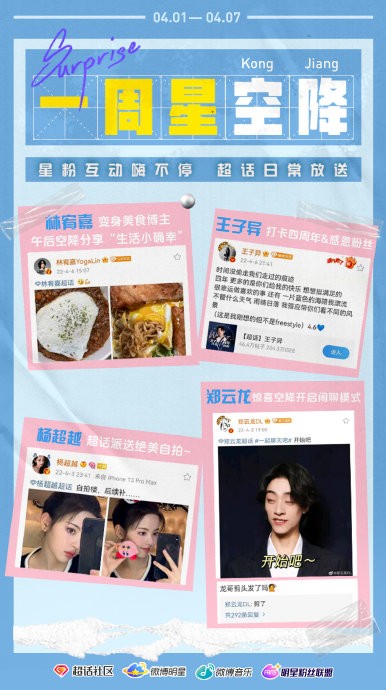上周共计474位爱豆空降宠粉,90位打卡签到,8场明星空降活动~太空浩瀚,岁月悠长,超话始终给你创造一颗烂漫的星粉行星