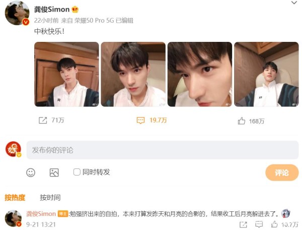 龚俊的转发量高达71万,评论量高达19.7万,点赞量高达168万,龚俊的流量其实和蔡徐坤差不多。朱一龙的转发量是64万,评论量是14.2万,点赞量是56.8万。