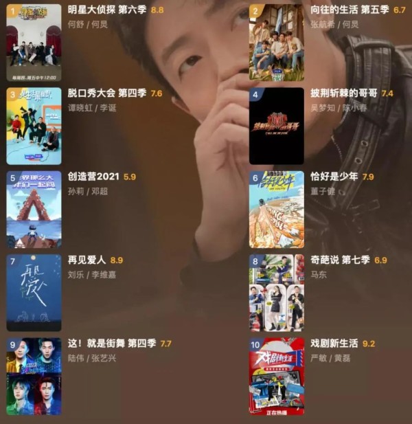 这一年,除了有很多值得关注的好剧以外,豆瓣还对综艺进行了盘点,平时熟悉的《明星大侦探第六季》位居第一,紧随其后的《向往的生活第五季》、《脱口秀大会第四季》、《披荆斩棘的哥哥》、《创造营2021》等。