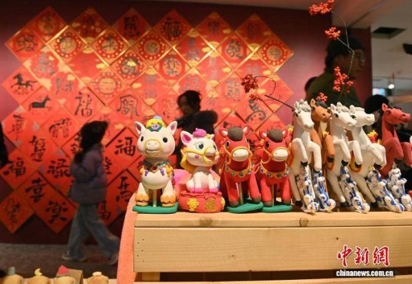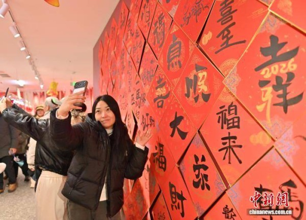 2月10日正值中国北方小年,长春商埠地历史文化街区正式焕新亮相。街区张灯结彩,年味浓厚,吸引众多民众及游客前来参观游览。民众漫步于修缮如旧的老建筑之间,参与特色活动,体验传统年俗。图为民众在与马年主题陈列合影留念。中新社记者 张瑶 摄