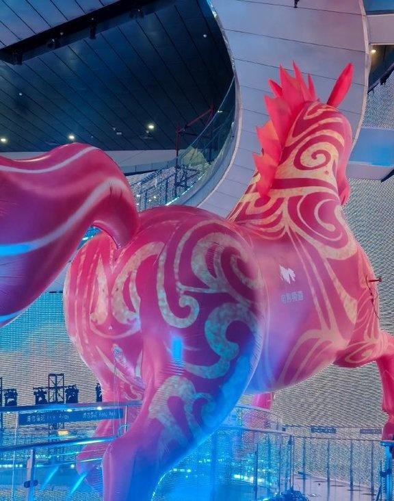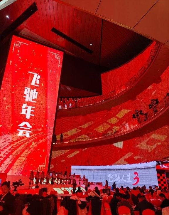 今年发布会现场的花活也足够多。红色主视觉,LED屏幕一溜排开。大圆桌、合唱团、巨型红马……比拼谁更有年味、谁更高科技。