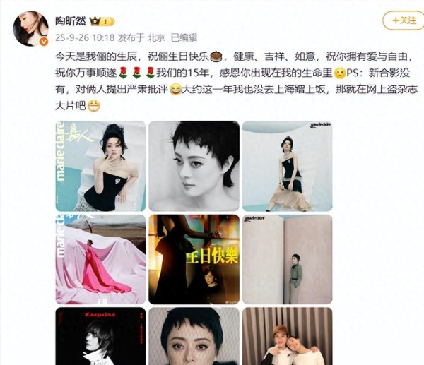 2025年9月26日,演员陶昕然在社交媒体上发布九宫格合照为孙俪庆生,却因一条网友留言掀起波澜。