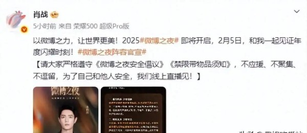 今年的娱乐圈,在年初就迎来了一次足以改变行业惯性的大事件。作为一年一度的华语娱乐盛典,微博之夜的高热度无需多言,但这一次的组织方式却让人颇有感触——2026年2月5日中午12:30,盛典全程通过线上直播呈现,没有线下观众,没有场外灯牌与呐喊,取而代之的是主办方和艺人群体共同发起的“线上一起嗨”的倡议。名单上的明星依旧重量级,肖战、杨幂、王一博、吴京等新老面孔齐聚,百余位人气艺人的确认让活动的关注度居高不下,但背后的变革意味远比热度更值得关注。
