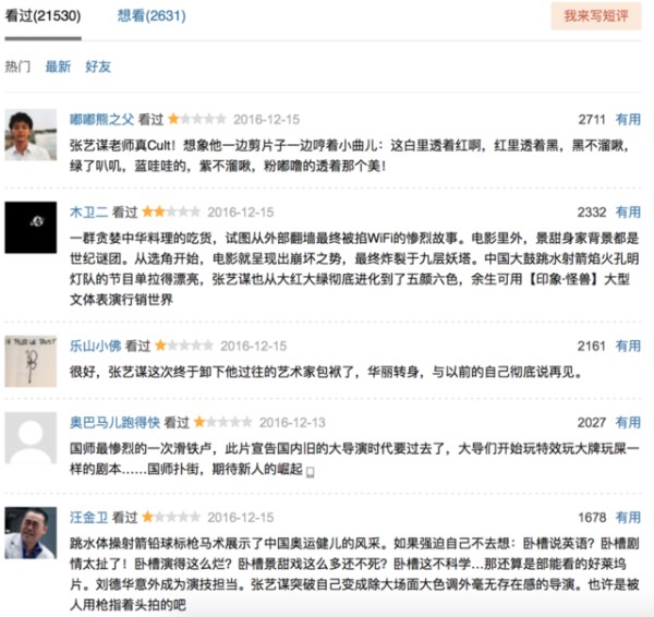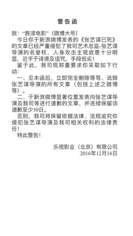 《长城》昨日(12月16日)上映,目前票房已达2.13亿元,但该片的口碑却是一个大问题,目前该片豆瓣评分只有5.2分。且就在昨天,乐视影业像微博大V@亵渎电影发出警告函,因其昨日发表微博“张艺谋已死”并配图《长城》电影海报,暗示张艺谋江郎才尽,“艺术生涯差不多完了”,《长城》令人失望。