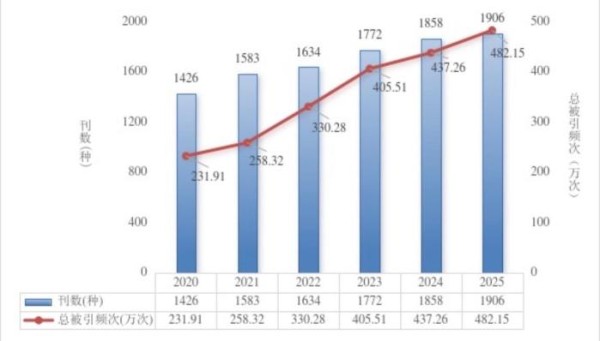 2020-2025版《WJCI报告》收录中国期刊数量和总被引频次变化。中国科协 供图