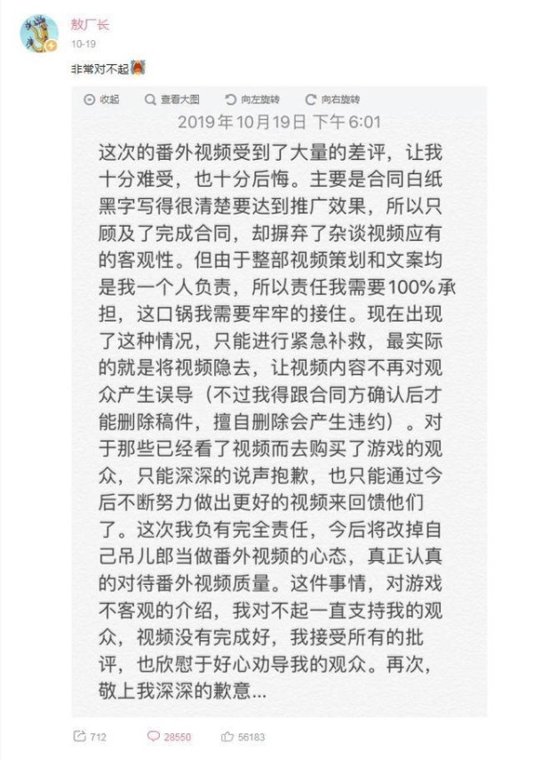 鉴于事件发酵速度之快,10月19日,敖厂长也迅速发布了相应的道歉公告并隐去了争议视频。不过从目前的事件热度看,玩家对于敖厂长和《大圣归来》的相关讨论或许还会持续一段时间。用KOL(关键意见领袖)去带动产品宣传,是时下最为流行且性价比较高的传播手段,只是,这种“接地气”的传播模式首次被粉丝反对则成为不少从业者热议的焦点。