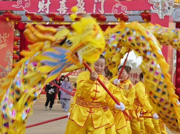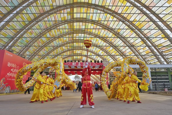 2月11日,龙灯队在村糖会现场表演。 新华社记者 刘坤 摄