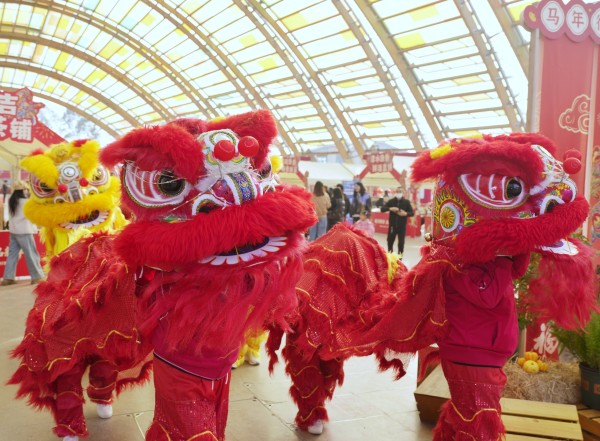 2月11日,舞狮队在村糖会现场表演。 新华社记者 刘坤 摄