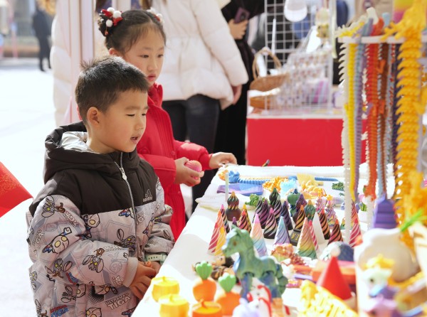 2月11日,小朋友在村糖会现场选购3D打印玩具。 新华社记者 刘坤 摄