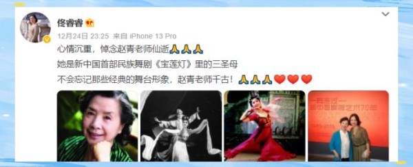12月24日晚,中国歌剧舞剧院发布讣告: 著名舞蹈家、舞剧表演艺术家赵青因病医治无效,享年87岁。遵照家属意愿,一切丧事从简,不举行告别仪式。消息一出,无数观众与同行在社交平台刷屏致哀,称“民族舞剧的黄金年代,从此关上一扇门”。