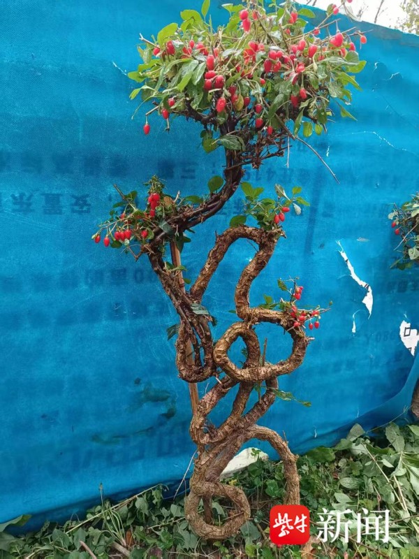 除寿字系列外,张士坤的枸杞“龙”字盆景同样令人称绝。大写意的“龙”字造型中,头、尾处点缀着绿叶红果,生动展现了龙的灵动与威严;金银花“龙”字盆景则以其遒劲的枝干和独特的造型,每一道枝桠的转折都暗合着颜筋柳骨,每一片新芽的萌发都呼应着墨色浓淡,将龙的神韵表现得淋漓尽致。而一盆枸杞的 “福寿双全”盆景,更是构思奇妙,枝干盘曲成上下的“福寿”两字,且中间笔画巧妙共用,体现了极高的艺术造诣。