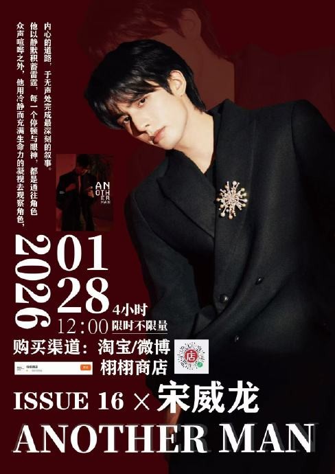2026年1月28日中午12点,《Another Man》宋威龙开年刊双封面正式开售。据宋威龙全国后援会发布的战报,截至下午16点限时结束,全渠道销量突破2.4万册,平均每分钟售出100册。这一数据在时尚杂志市场表现突出,尤其对比其他同期刊物——例如朴志晟《CHIC》开年刊首日销量1.5万册、黄明昊《Another Man》2025年刊的冲刺式晒单活动,宋威龙版本的"限时不限量"策略成功激发了粉丝的集中消费力。