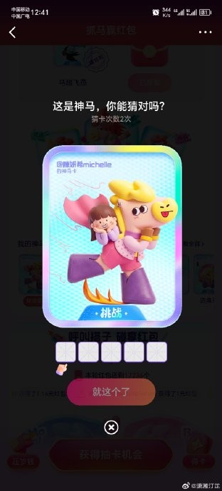 2026年春节微博的“神马卡”活动中,袁一琦的卡片答案因融合多重粉丝文化符号、谐音梗与个人创意,设下六字谜题“元气弹弹弹马”,引发全网竞猜却难倒众人,连粉丝也集体挠头。