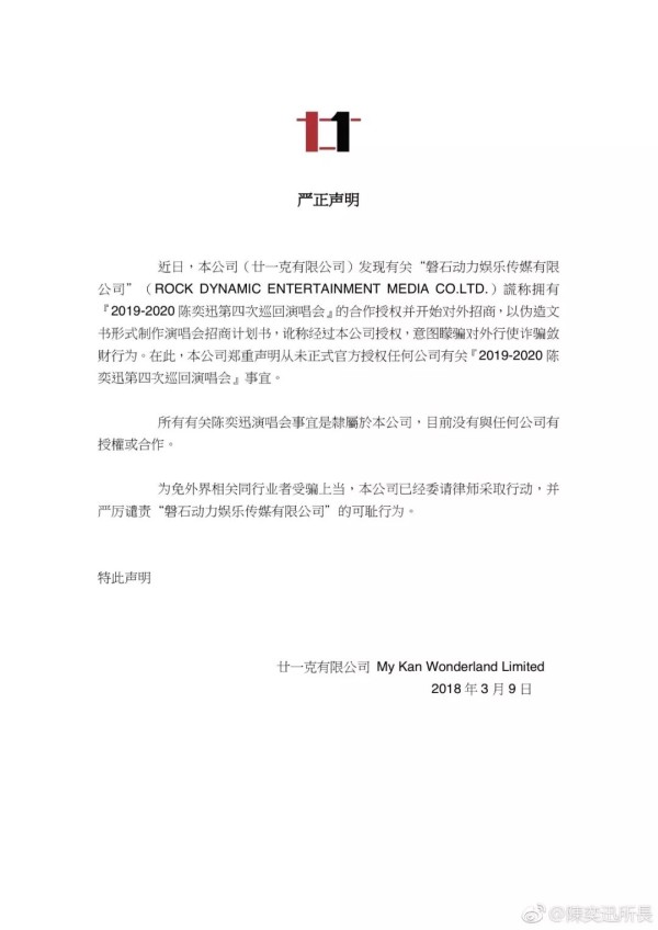 据声明,近日,“磐石动力娱乐传媒有限公司(ROCK DYNAMIC ENTERTAINMENT MEDIA CO.LTD)”谎称拥有“2019-2020陈奕迅第4次巡回演唱会”的合作授权,以伪造文书形式制作演唱会招商计划书,意图蒙骗对外行使诈骗敛财行为。