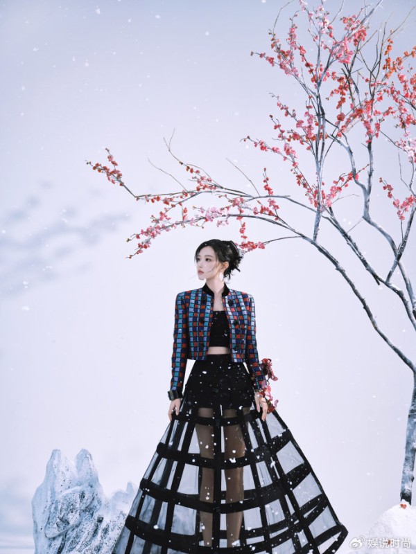 拼色格子短款外套内搭黑色抹胸搭配黑色纱裙,程潇的这款造型也是一场传统与现代的完美结合,充分展现了她独特的时尚品味和对古典美的理解。