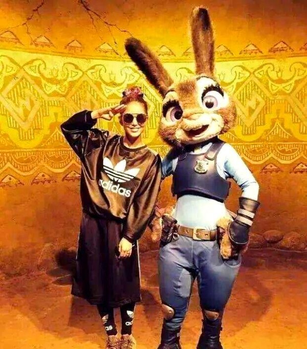 天王嫂昆凌,身着阿迪运动装,佩戴炫酷墨镜,展现出随性而休闲的一面。她与兔子朱迪合影时,俏皮地敬了一个礼,流露出满满的萌感和少女情怀。