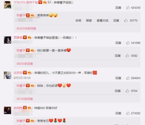 张馨予宣布结婚众明星祝福,每条都回复礼数周到,何洁的话成亮点