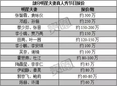 于是,不少明星CP将眼光投向了真人秀综艺。《为她而战》宣传总监刘原曾说:“两个当红明星夫妻的合体价一定是1+1大于2,绝对不会低于百万身价,而如果一方强一方弱,则大部分是打包价,主要还是看影响力和曝光程度。”