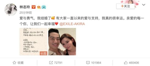 2019年6月6日,林志玲突然宣布结婚,嫁给日籍男星黑泽良平。