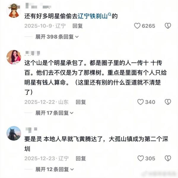 有趣的是,网上还有一种特别的说法。有人说,如果运气太顺的人,不要轻易去大孤山,因为那里的能量可能会被分走。普通人更适合选择四月的杏花节,那时的天气舒适、风景如画,不仅可以拜财神,也能游览孔庙。别觉得明星迷信很离谱,灵隐寺、五台山、妈祖庙这些地方,明星们也常常前去祈福。只不过,大孤山这次因明星们的频繁打卡而成为话题,才被大众扒得个底朝天。