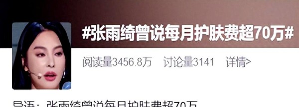 张雨绮坦言每月护肤开销超过七十万元人民币!