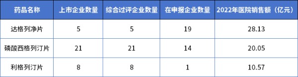 随着国家集采的持续推进,降糖药领域已基本实现应采尽采。按销量计,2022年医院市场中,纳入国采的降糖药品种占85%的市场,中标的品牌占66%的市场。据药智咨询统计分析,目前降糖药综合过评(原研+过评)企业数量≥5家且未纳入国采仅6个品种,其中达格列净片、磷酸西格列汀片和利格列汀片2022年销售额均大于10亿元,极大可能被纳入第九批国家集采。达格列净片目前仅5家企业获批,但申报企业高达19家;而磷酸西格列汀片已有21家企业过评,仿制竞争非常激烈。相比而言,利格列汀片拥有超10亿的市场规模,竞争格局较达格列净和西格列汀也较好,建议仿制药企可以加以关注。