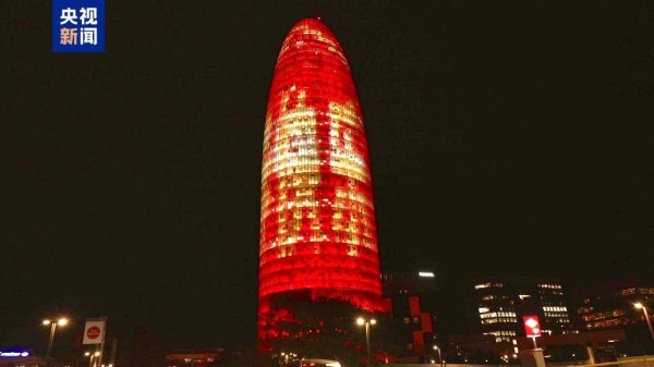 西班牙巴塞罗那荣耀塔点亮“中国红”并滚动“新春快乐”的祝福 图片来源:央视新闻