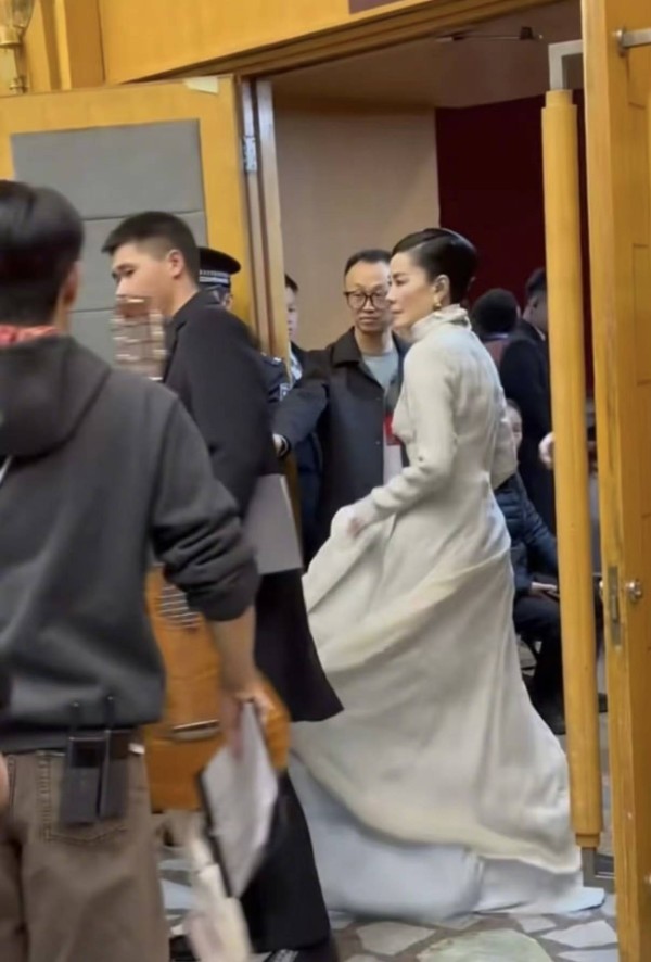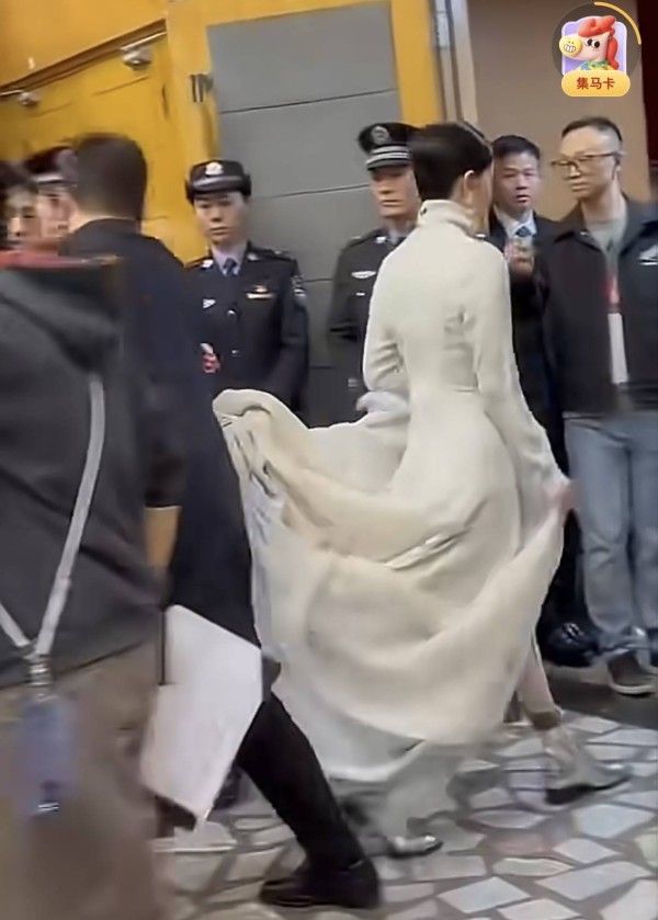 她穿白色修身呢大衣,内搭许是演出时的拖尾长裙,同样是白色系。拖尾款的设计,比去年的白裙更华丽繁杂了些。