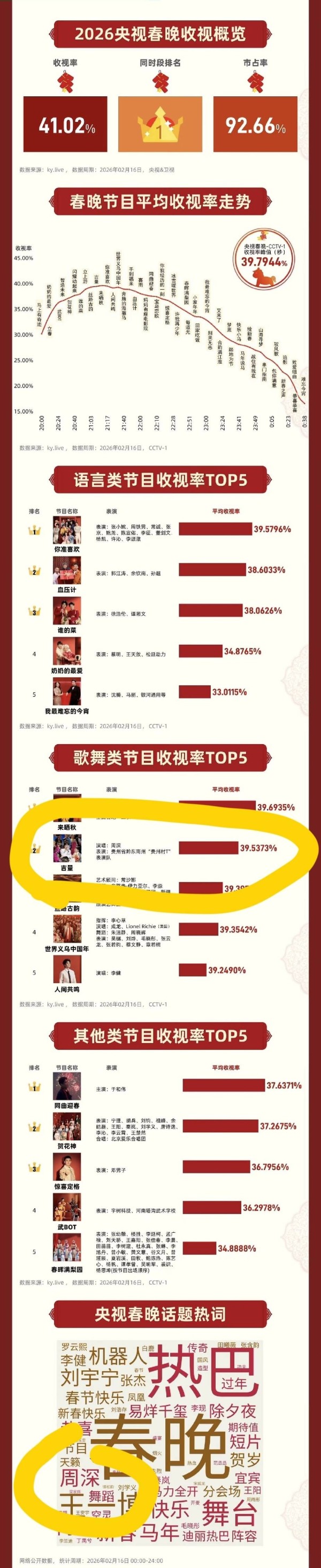 这个节目贡献了马年春晚歌舞类节目收视率的第二名,高达39.5373%,仅次于排第一名的凤凰传奇。