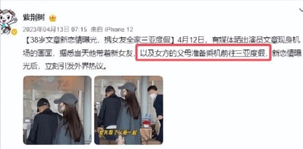 今年4月,文章还带着新女友和父母一起去三亚度假呢。这是要见家长的节奏啊!看来这段感情是认真的啦。